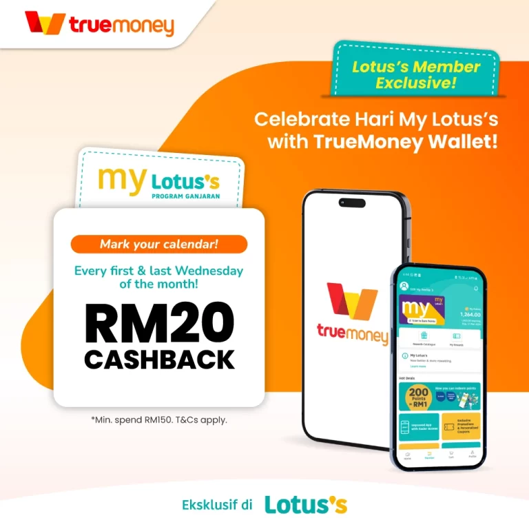 Setiap Rabu pertama dan terakhir setiap bulan, TrueMoney dan Lotus’s berganding bahu untuk memberi anda pulangan tunai RM20. Tiada langkah yang rumit—hanya penjimatan terus ke dompet anda.