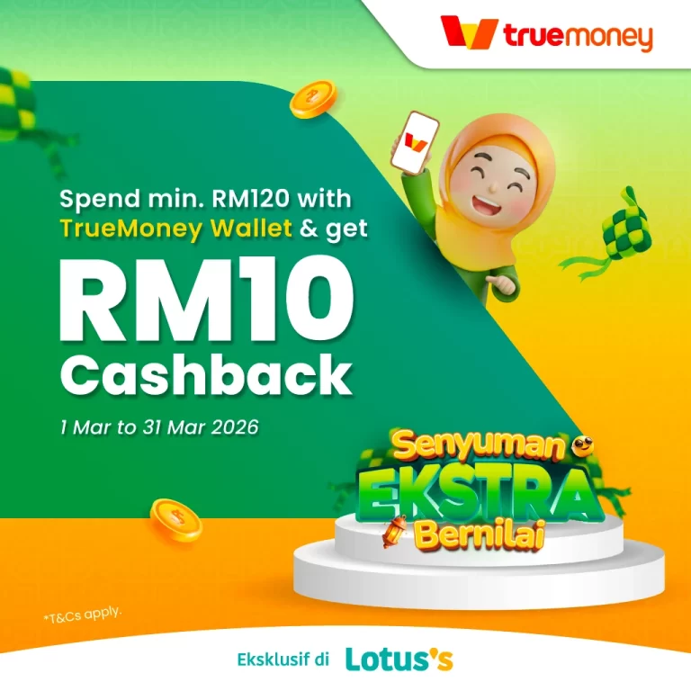 Make this Raya extra rewarding with “Senyuman Ekstra Bernilai”! Spend RM120 or more in a single receipt at Lotus’s using TrueMoney Wallet and enjoy RM10 cashback instantly!